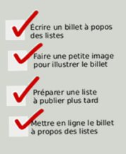 Les listes personnelles et certaines listes pour s’organiser sont celles qui évoluent le plus et dont la comparaison dans le temps est utile à l’introspection. Collectionnées, les listes reflètent une vie, une identité; elles ont une âme, une personnalité – comme un journal intime ou… un blogue. Non? C’est personnel, et la plupart des gens ne confieront pas faire toutes ces listes, sur papier ou dans leur tête, parce que ça paraît… enfantin, peut-être.