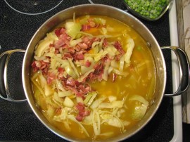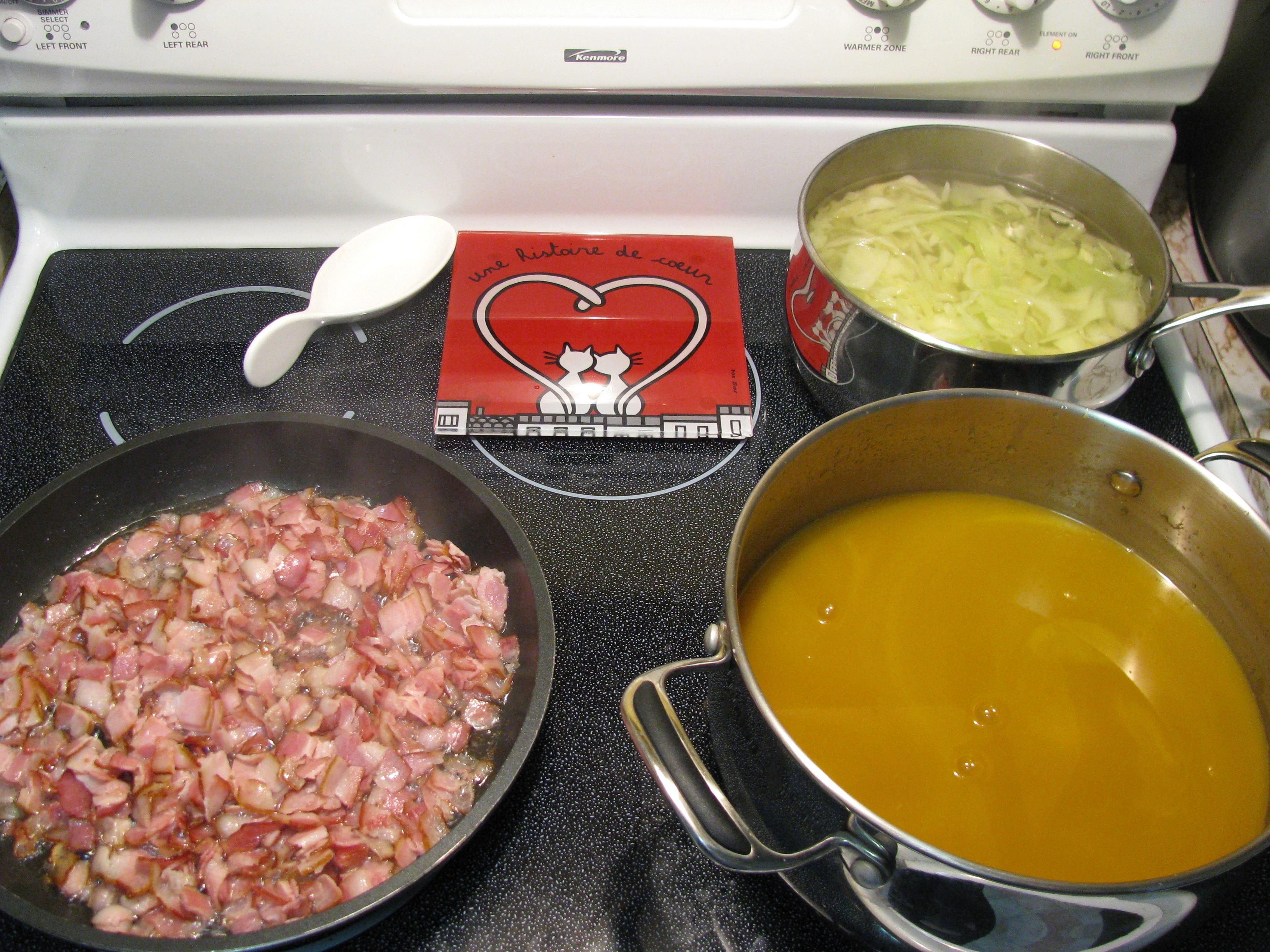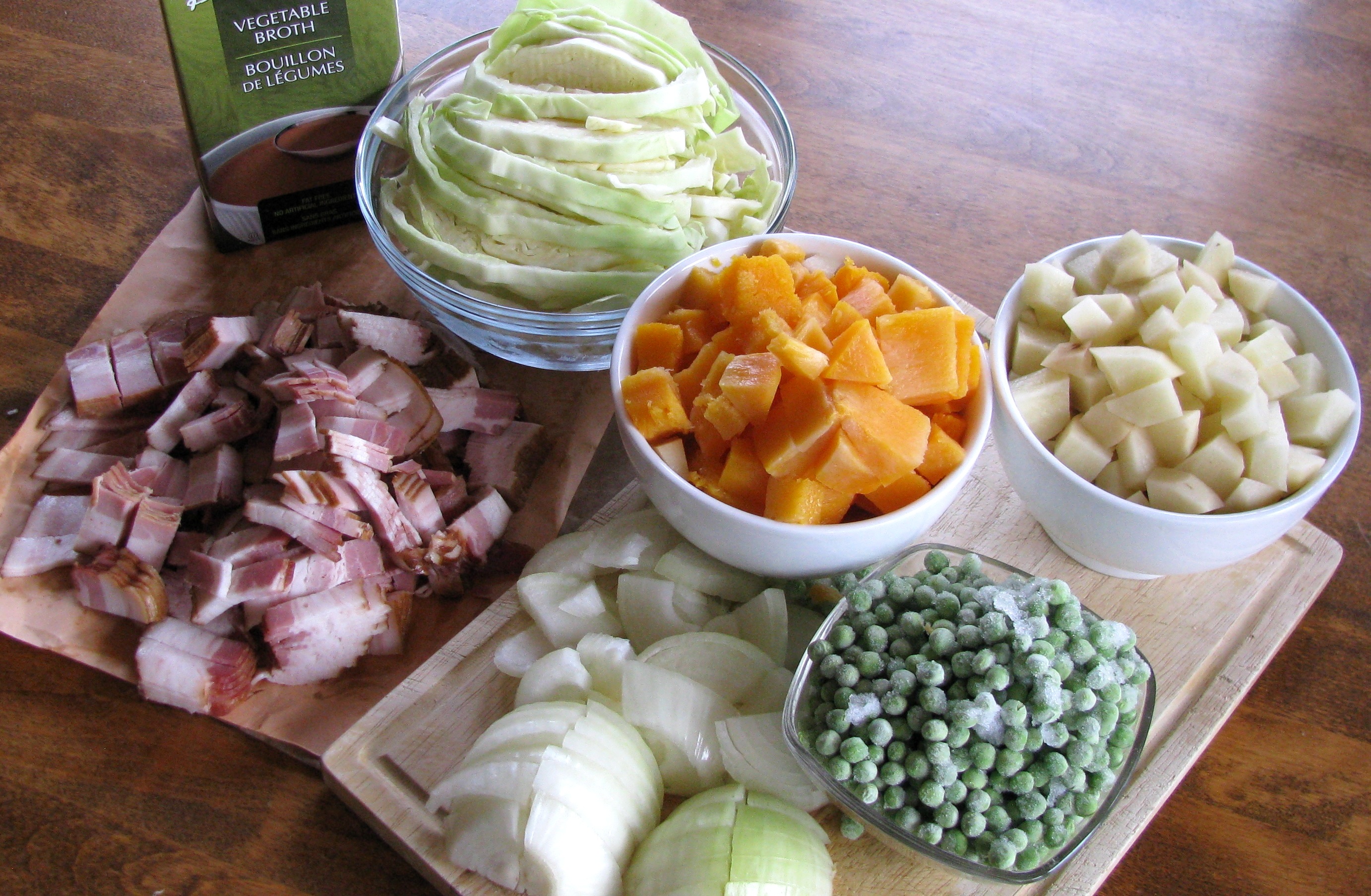La soupe aux choux était donc appelée à faire partie de ma vie. Comment en faire mes choux gras? Avec du bacon, bien sûr! Voici donc la petite recette que j’ai mitonnée et qui fait maintenant partie de mon cycle culinaire à raison de deux ou trois fois par saison froide (novembre à avril, environ). Le temps d’aujourd’hui s’y prête très bien. Comme toute personne occupée, a fortiori comme nouvelle maman, je n’ai pas beaucoup de temps pour cuisiner; cette recette donne de 8 à 12 portions individuelles que je répartie en trois parts: une part pour consommation immédiate et deux pour congélation. Pour une quantité « normale » de soupe, vous pouvez aisément réduire les quantités de moitié. En rentrant du bureau, passez chercher les ingrédients qui vous manquent. Moi j’en sors une part du congélateur pour ce soir.