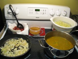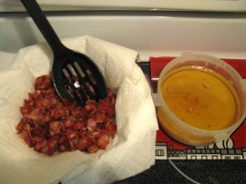 - Dans une grande poêle, faire cuire le bacon jusqu’à tendreté désirée. L’idéal est de le rendre croustillant pour qu’il relâche ses sucs dans la soupe plus tard. Une fois cuit, versez le bacon dans un tamis sous lequel vous avez placé un bol pour récupérer le gras de cuisson que vous conserverez au congélateur pour usage futur. Réservez le bacon en le plaçant sur du papier essuie-tout afin de retirer un maximum de gras. Dans la même poêle, sans la laver, faire dorer les oignons. Au besoin, déglacez avec une gorgée de vin blanc ou une cuillerée de bouillon pour éviter que les oignons ne collent dans la poêle. Réservez.