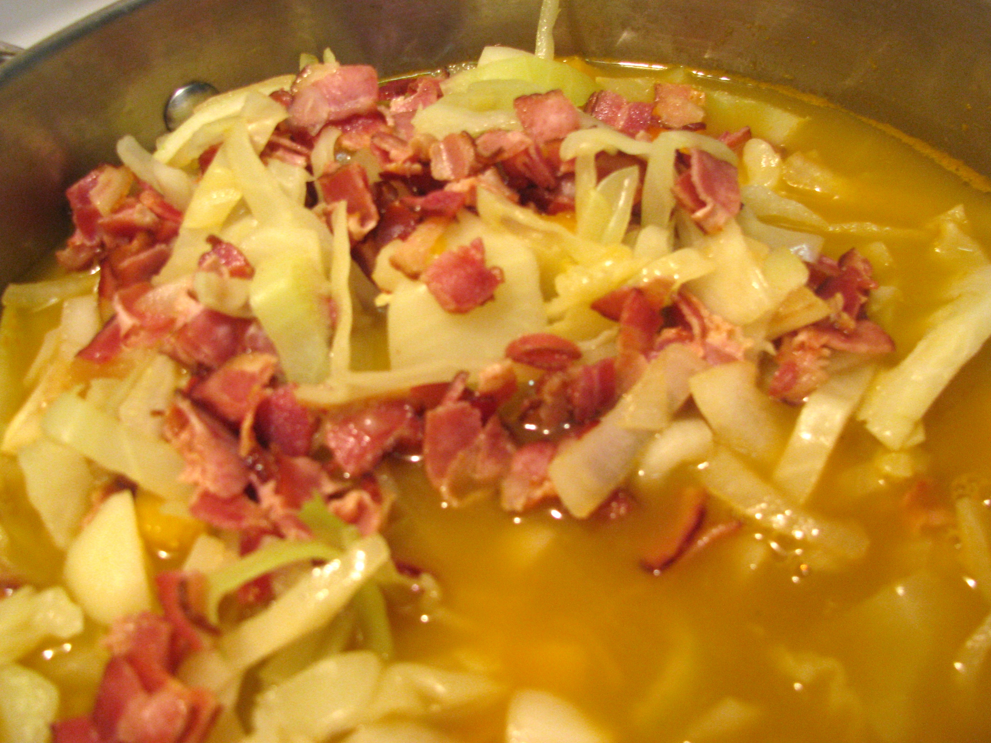 Finalement dans cette recette de soupe au chou il n’y a que le chou comme tel qui ne m’enthousiasme pas. Malgré ses qualités, le vaillant crucifère perd beaucoup de son attrait une fois bouilli. Moi dans ce genre de soupe je remplace la pomme de terre par de la patate douce maintenant, c’est pas mauvais.