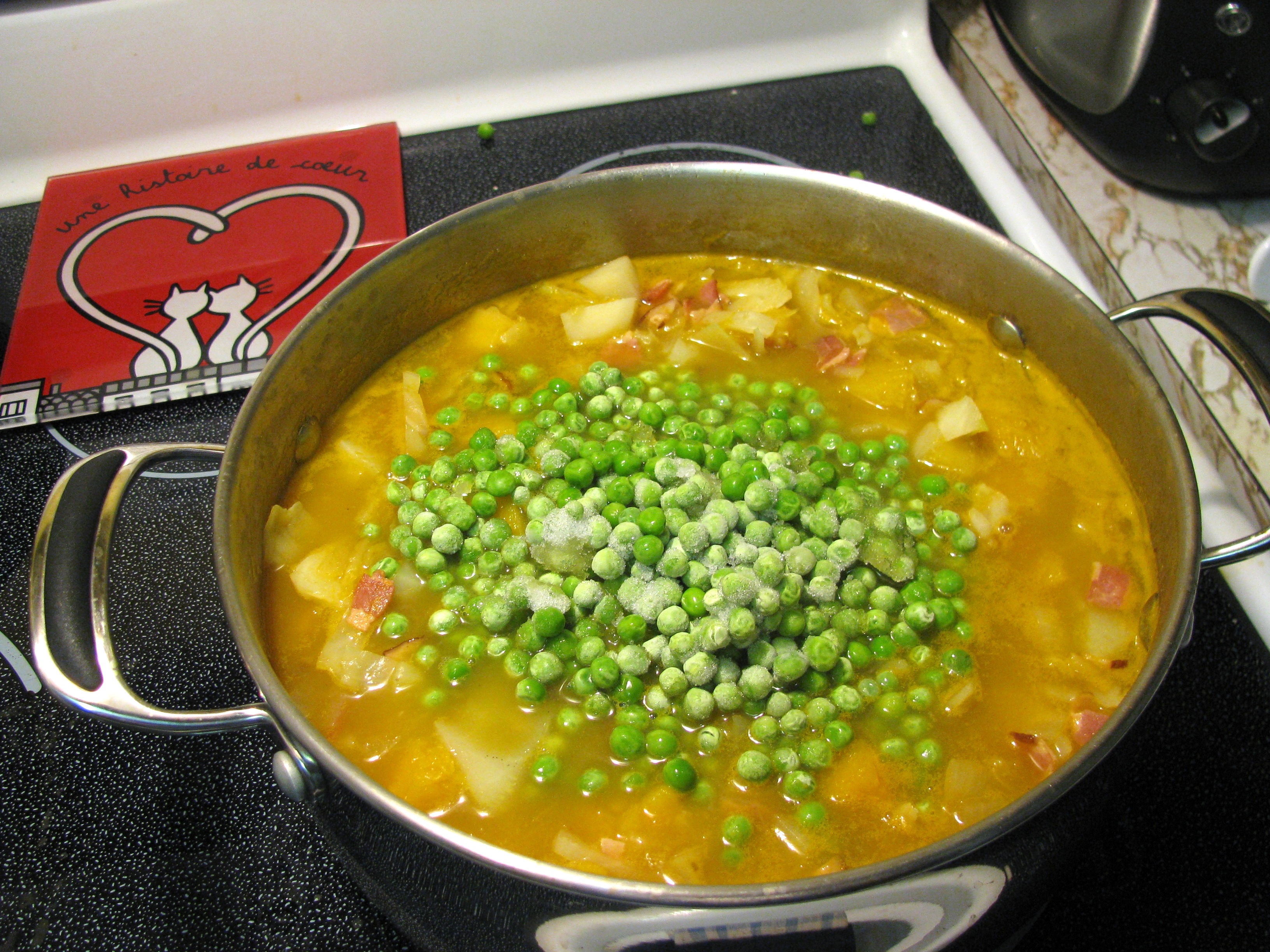 - Une fois les pommes de terre (presque) cuites, ajouter tous les ingrédients sauf les pois. Saler et poivrer au goût. Laissez mijoter sur feu moyen-faible pendant environ 20 minutes pour réchauffer la courge, cuire le chou et lier les saveurs. La consistance de la soupe épaissira un peu.