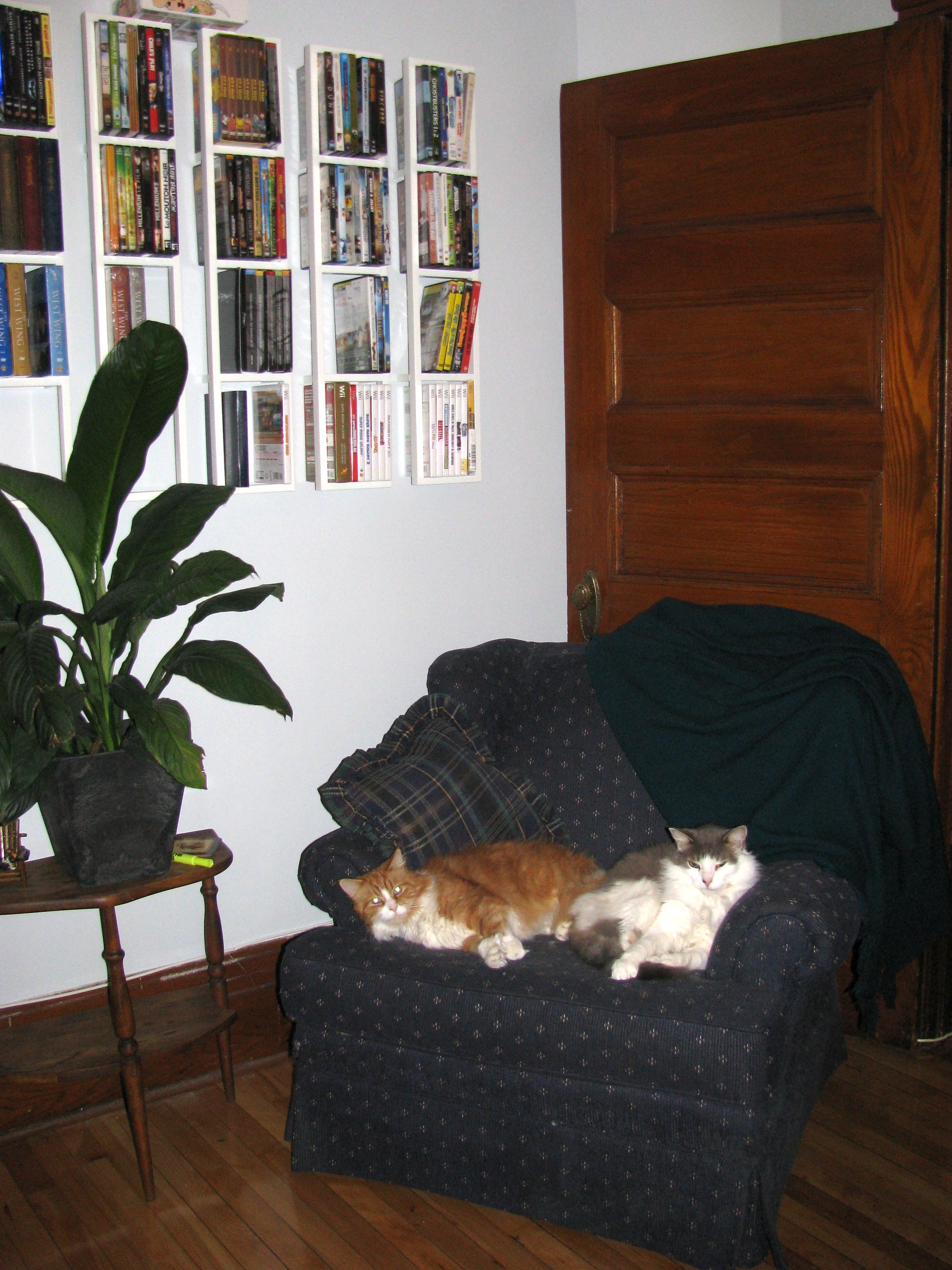 Mes chats cherchent donc une nouvelle maison. Je souffre derechef d’une culpabilité angoissante à l’idée de les savoir tourner en rond dans leur cage, eux qui vont dehors même en plein hiver. Je leur cherche activement une nouvelle famille, ensemble ou séparément? Mais c’est si difficile de placer des vieux matous, les gens semblent leur préférer les bébés chats. C’est vrai que des bébés chats, c’est mignon et énergique, mais des matous c’est serein et charmant.